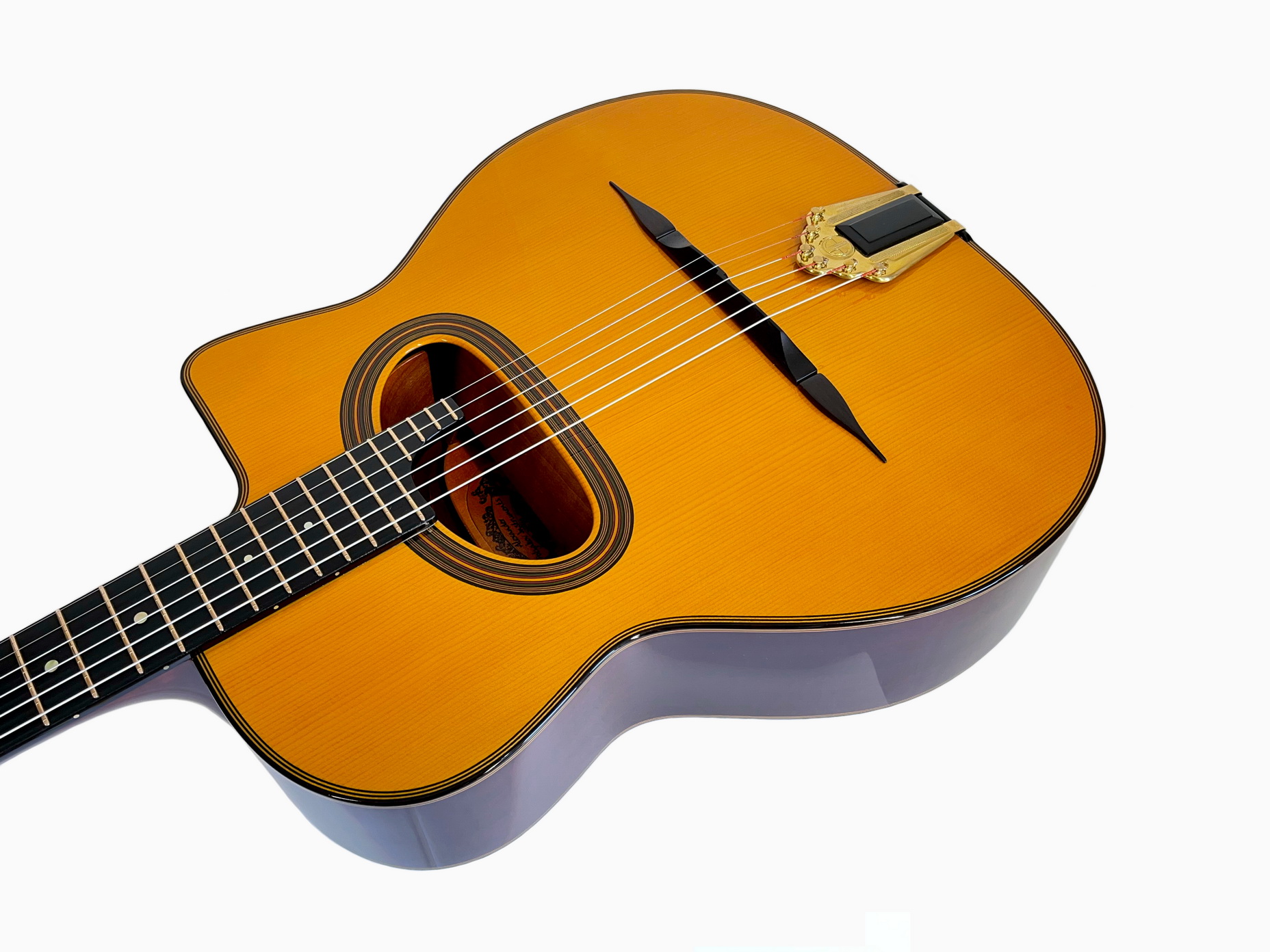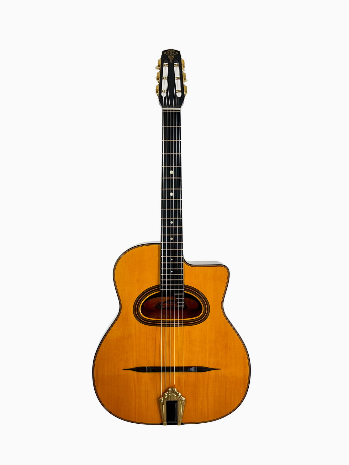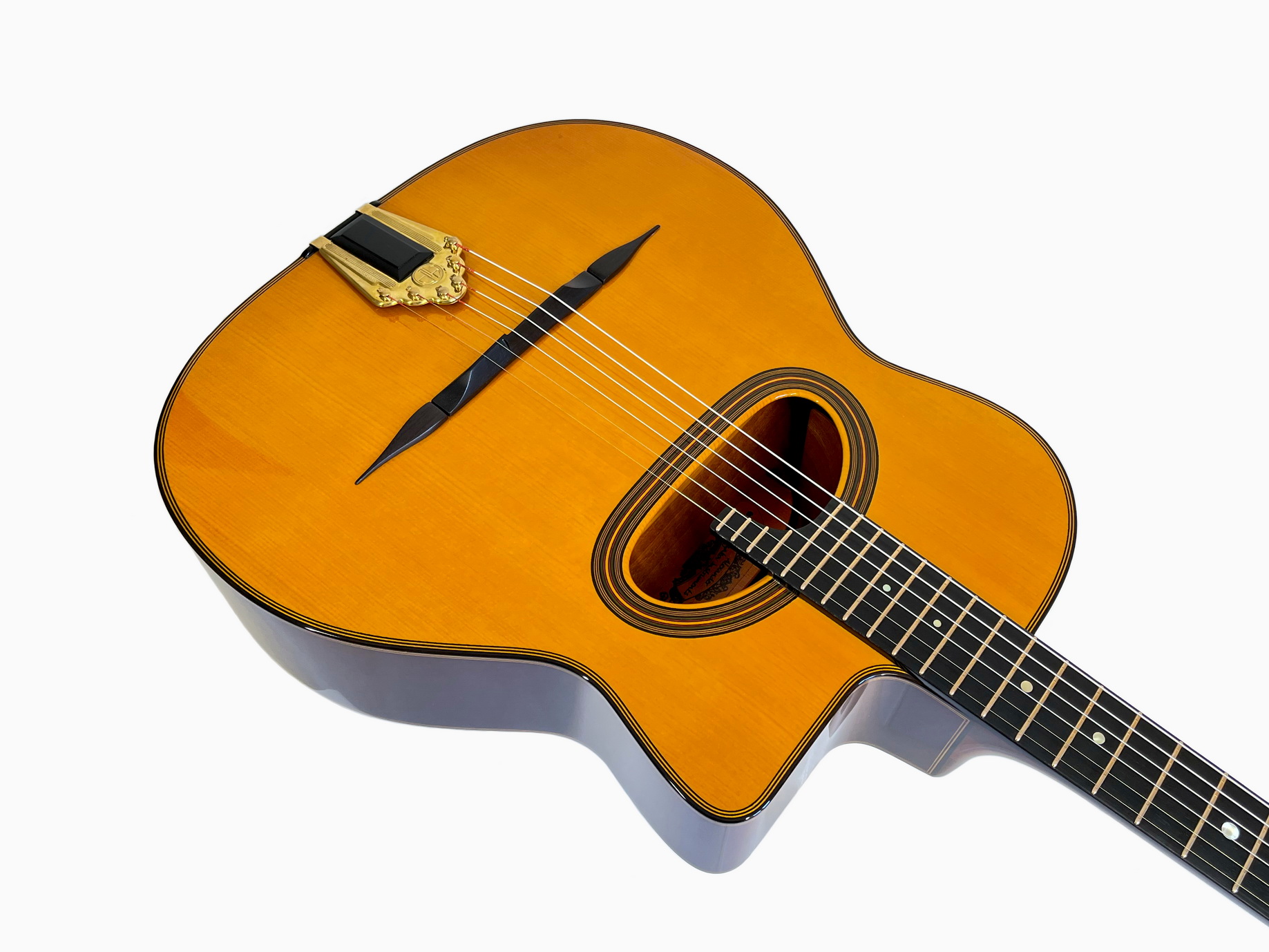 Accurate reproduction of Maccaferri original orchestra model with internal resonator. The guitar has built according to original plans. The top has pliage and the neck has aluminium reinforcement rods and original headstock joint, short 640mm scale and 12th fret neck to body joint, varnished interior as original guitar, nitrocellulose finish and Selmer's tuners replica! Weight of the guitar is 2 kilo.