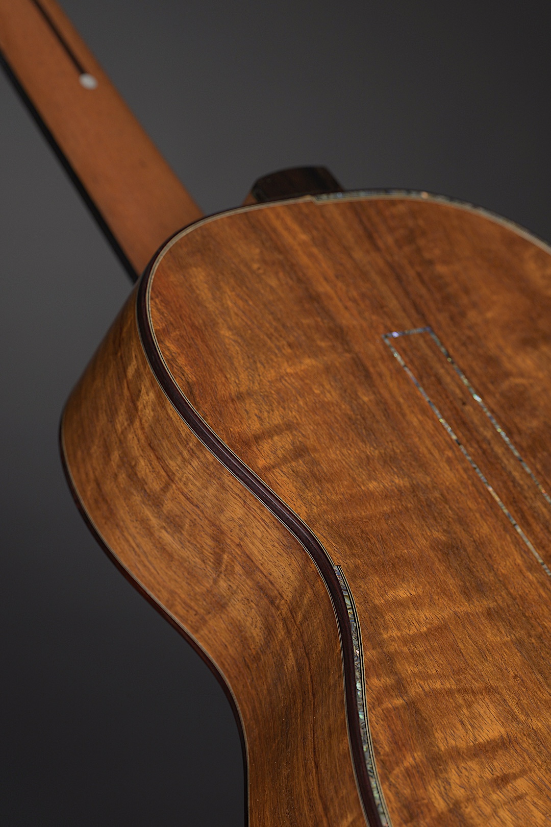 C’est une guitare avec une grande homogénéité et une longueur de son bien définie. Elle est très « facile » dans toute sa tessiture, offre une belle brillance dans les aigus notamment. L'acacias, d'une variété de Koa est originaire d'Afrique, d’une rare beauté et lui apporte un caractère très attachant. Cette guitare, réalisée en fin 2025, ne demande qu'à s'épanouir entre les mains de son prochain propriétaire.
