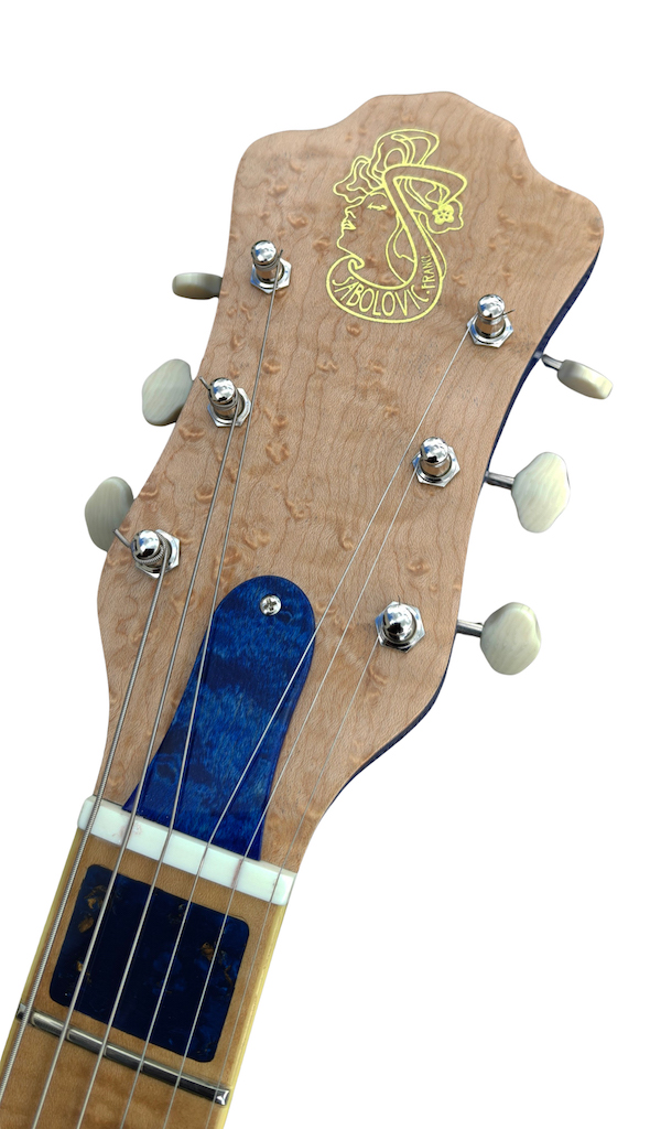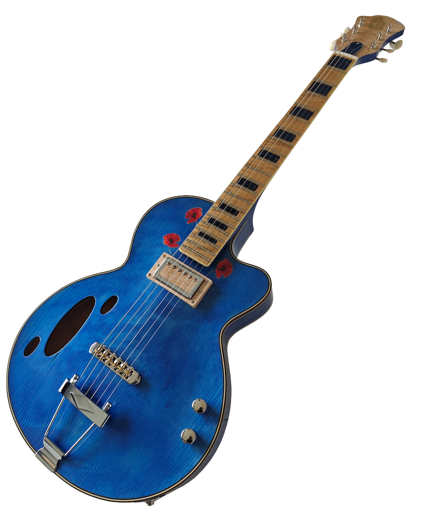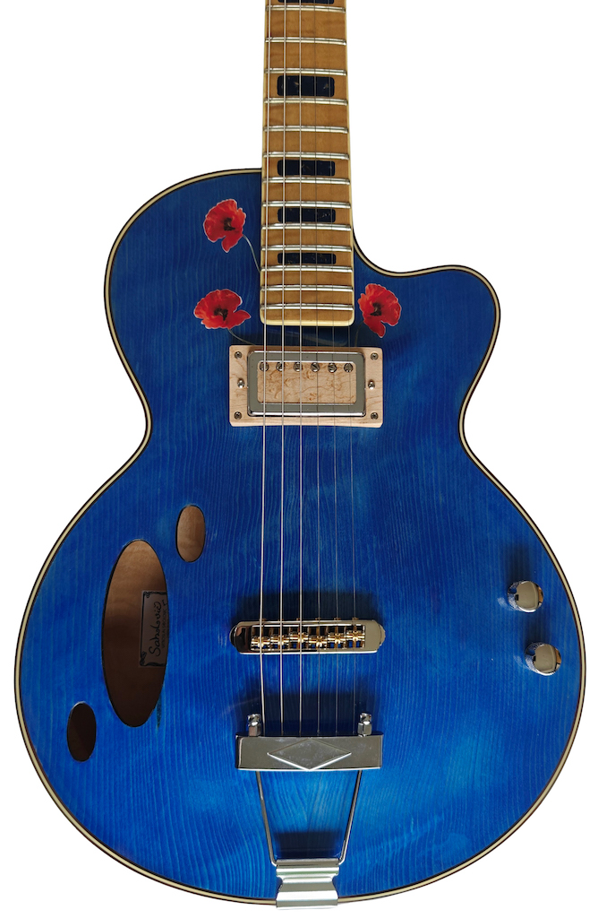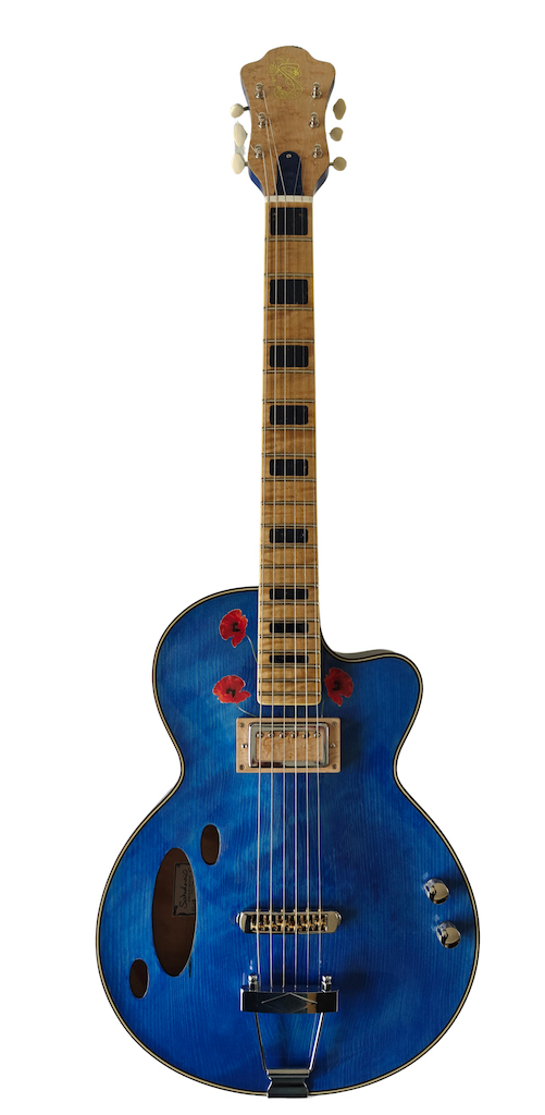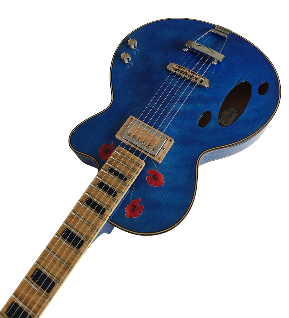 This one-of-a-kind model is handcrafted by Sabolovic Guitars in France, finished in a vibrant deep Bleu Majorelle and decorated with hand-painted red poppies. A true collector’s piece — yet made for real playing.